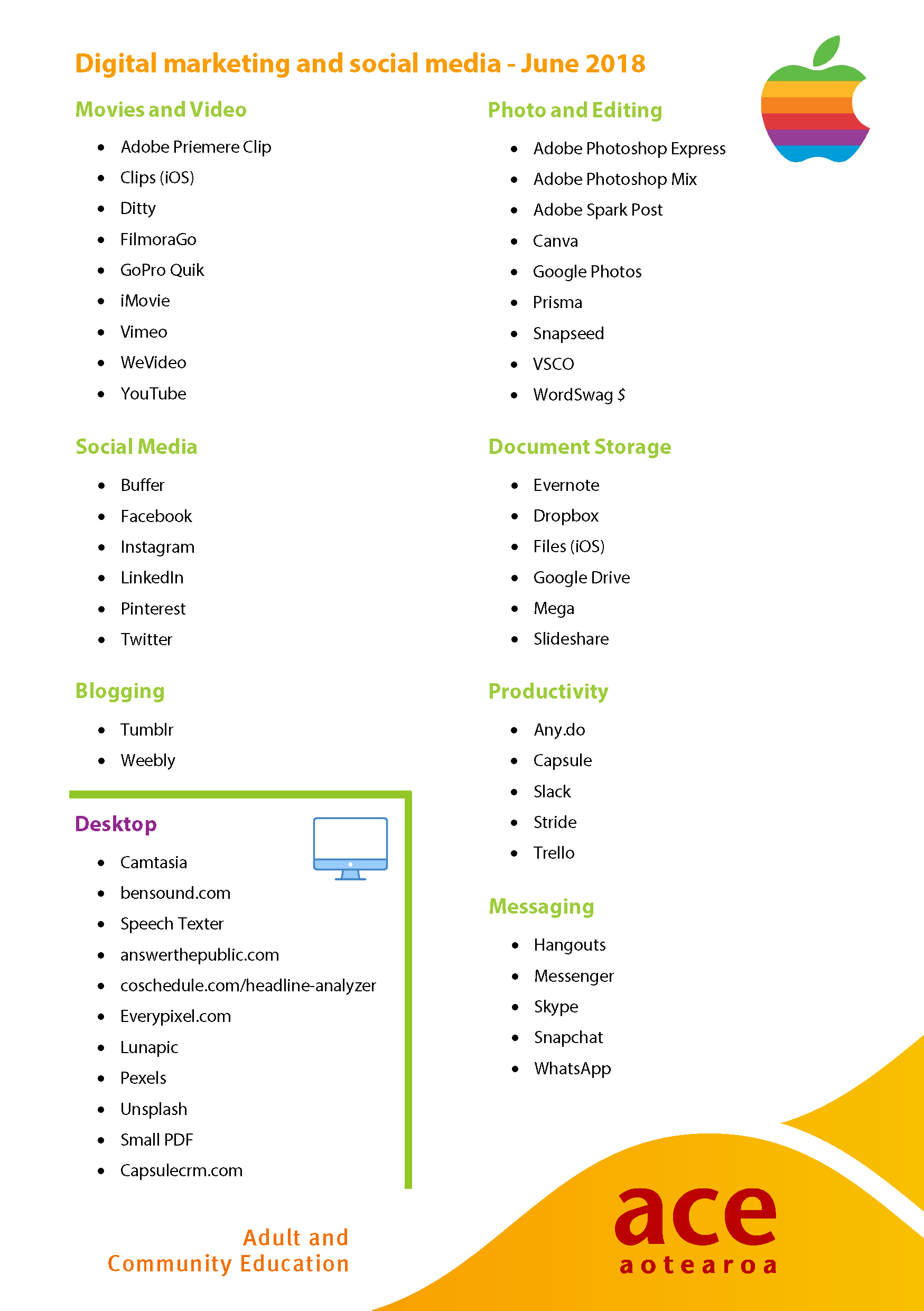 Tai is well known to the ACE Sector. His roles have included ACE Aotearoa office and website manager, workshop presenter and social media strategist. He has also supported key events such as the Hui Fono, ACE Conference and Adult Learners' Week. Since returning from overseas in 2016, Tai has managed a wide range of projects. He has a background in education and youth work and a passion for performing arts, social media, and communications.