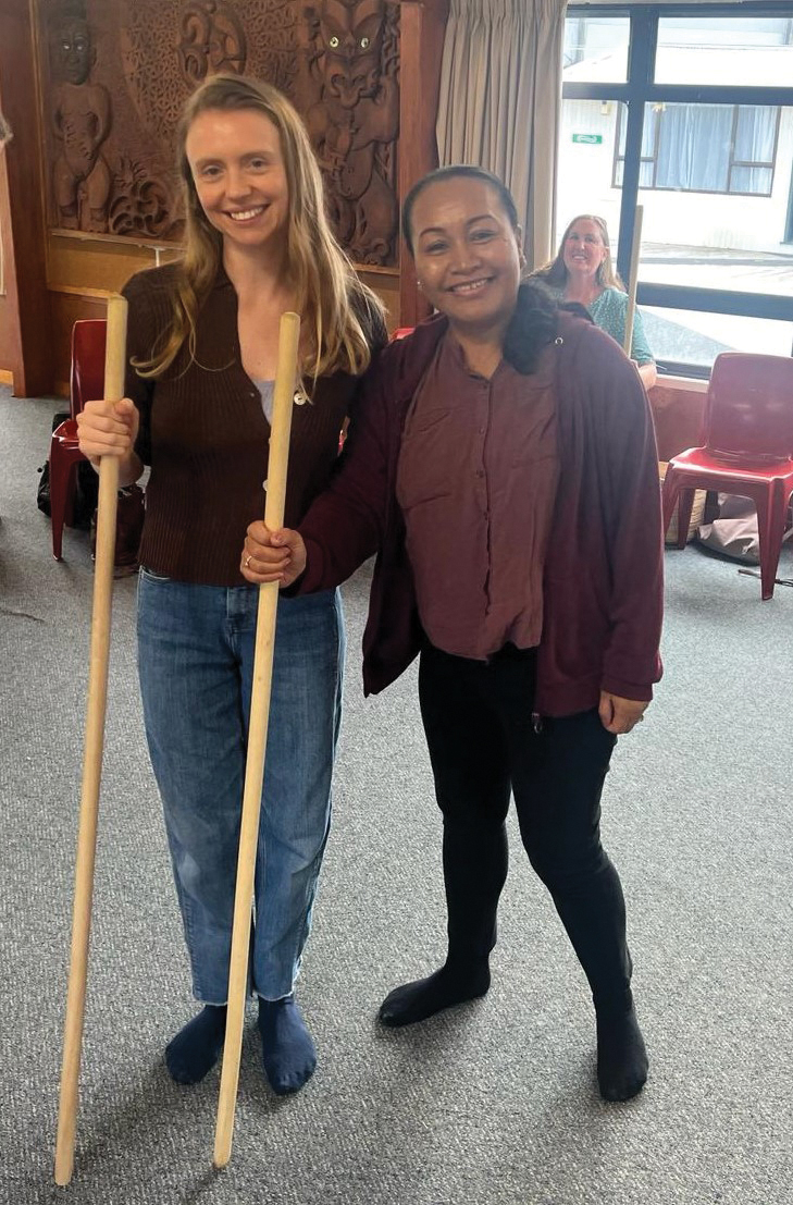 They were traditionally welcomed onto the marae by Matua Adrian and his high school ākonga. “Over the course of the day we deepened our understanding of pōwhiri and mihi whakatau, engaged in tī rākau (single long-stick games), learnt new waiata mōteatea and waiata poi. We also learnt how to make poi, which was a highlight for our group and it provided a fun team building exercise. Matua Adrian covered lots of tikanga, explaining ways to keep ourselves safe – both in minds and bodies.”