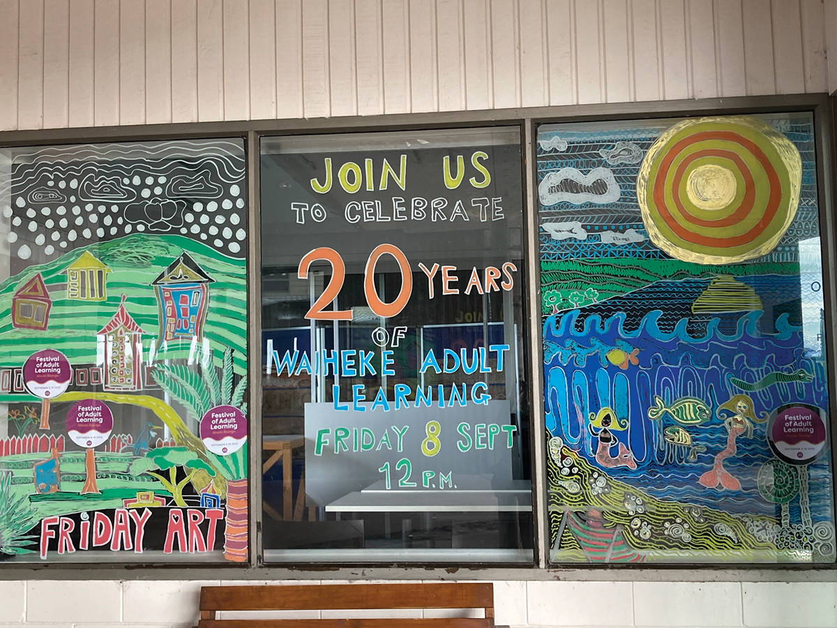 Waiheke Adult Learning (WAL) combined two celebrations in September – the Festival of Adult Learning and acknowledgement of their 20 years’ service as an incorporated society within the Waiheke community. To mark the occasion, an event was held at the centre on International Literacy Day, and students illustrated the office window and shared their stories of involvement.